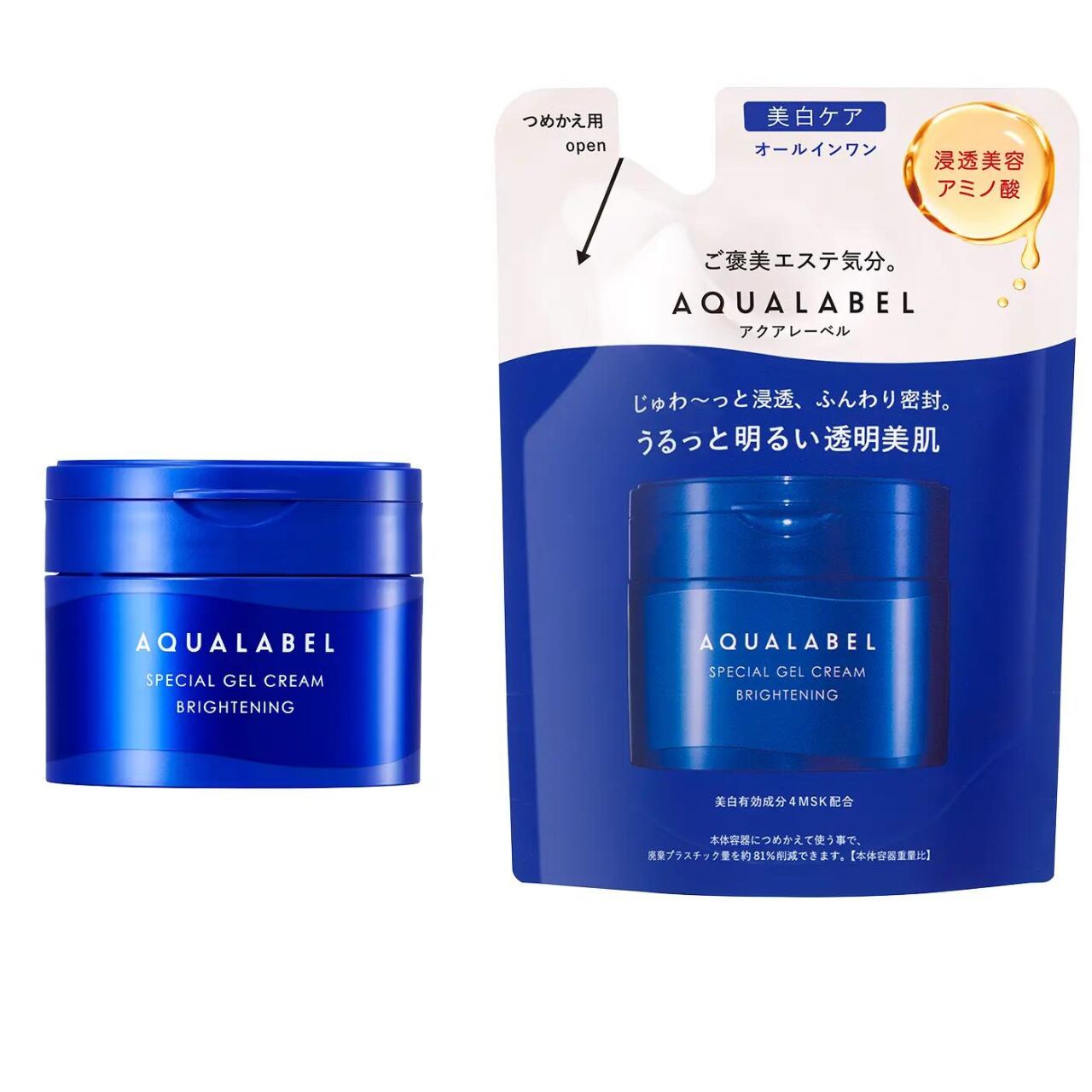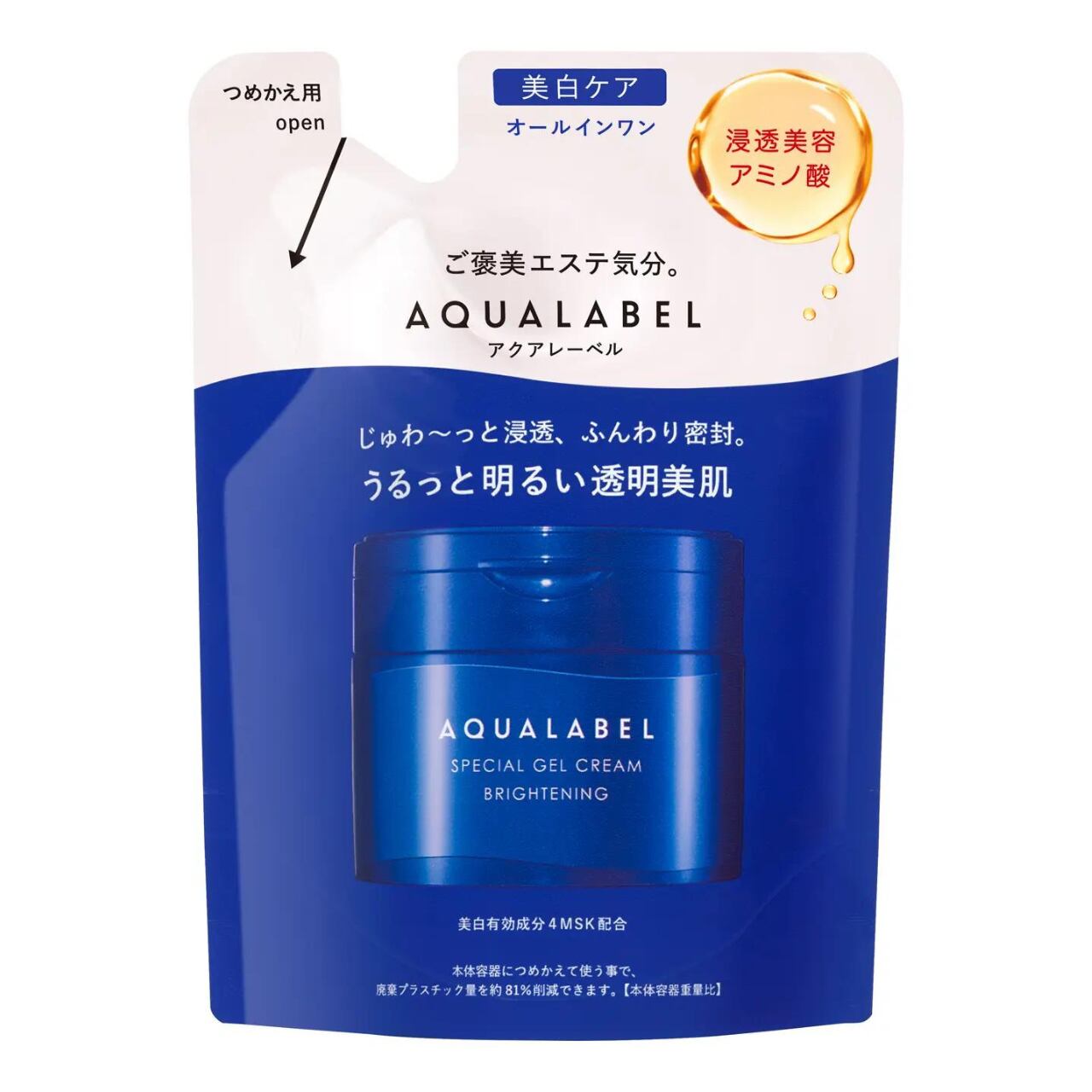 A jelly gel texture penetrates deep into the skin. Moisturises (D-glutamic acid, DL-alanine, DL-methionine) and gives skin a bright, translucent complexion.Contains THE SHISEIDO original rich and expensive fomula, 4MSK for promoting turn-over and brightning uneven skin tone.Highly functional all-in-one gel cream with five functions in one product (lotion, emulsion, cream, serum and mask).⦅AQUA LABEL is one of the SHISEIDO owning brands⦆